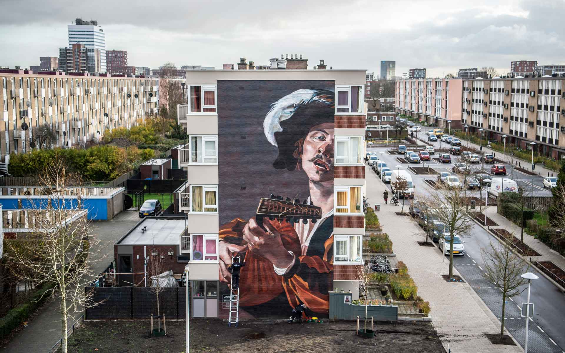 Deze muurschildering is een gigantische reproductie van De luitspeler van Dirck van Baburen uit 1622. Het thema van